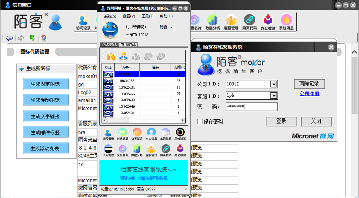 即使您的客戶下線后重新與您對話,他的訪客名片與歷史對話也不會消失,方便您的識別。并可以批量創(chuàng)建客戶名片(適用于光盤),當訪客觀看光盤時可以識別該客戶資料。